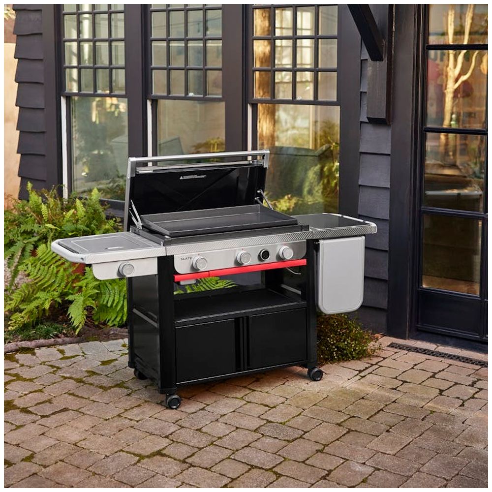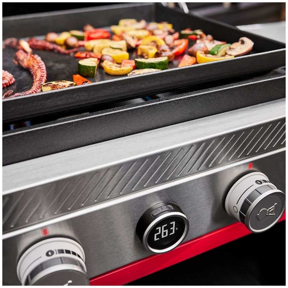 Ανακαλύψτε τη νέα Weber SLATE GPSD 76 cm Premium Griddle με πλαϊνή εστία μαγειρέματος, ψηφιακή ένδειξη θερμοκρασίας και μεγάλη επιφάνεια ψησίματος που φτάνει πάνω από 260°C και θερμαίνει ομοιόμορφα από άκρη σε άκρη, ώστε το φαγητό σας να μαγειρεύεται σταθερά όπου κι αν το τοποθετήσετε. Η αντικολλητική, επιφάνεια με εμαγιέ πορσελάνινη επίστρωση είναι έτοιμη για μαγείρεμα ακριβώς μόλις την βγάλετε από το κουτί, ώστε να μπορείτε να δημιουργήσετε ζουμερά smashed μπιφτέκια, αρωματικές πατάτες, όμορφα ψημένα θαλασσινά, λαχανικά και πολλά άλλα. Επιπλέον, με το σύστημα προετοιμασίας, μαγειρέματος και αποθήκευσης Weber Works μπορείτε να έχετε πρόχειρα τα είδη μαγειρέματος και καθαρισμού, να μεταφέρετε τρόφιμα και καρυκεύματα από την κουζίνα στο ταψί, να μετατρέψετε το βοηθητικό τραπέζι σε βάση προετοιμασίας και να αποθηκεύσετε εξοπλισμό σε καλά κλεισμένα δοχεία (τα αξεσουάρ πωλούνται χωριστά).