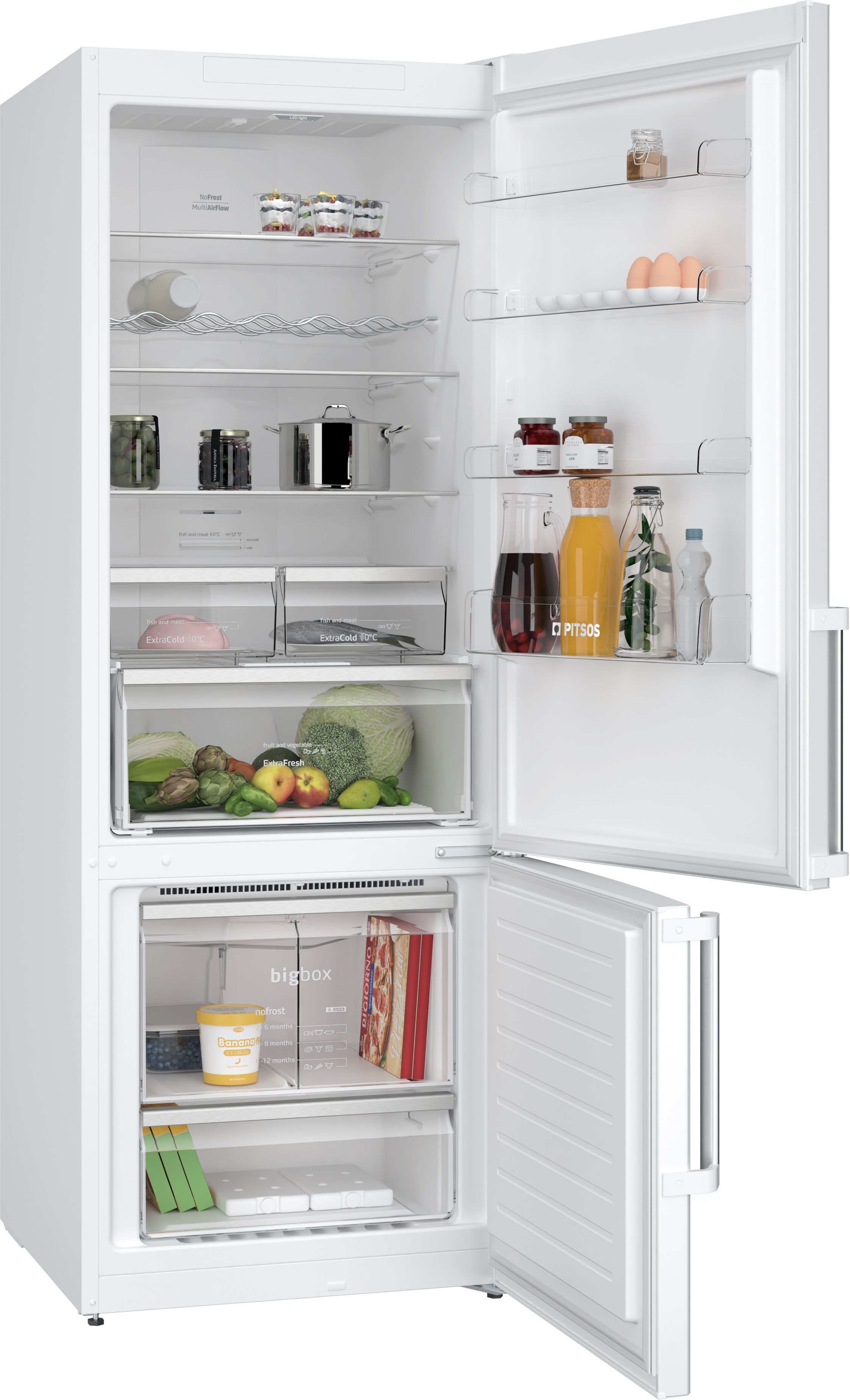 Ψυγειοκαταψύκτης Full ΝoFrost, μεγέθους XXL με συρτάρια ExtraFresh & ExtraCold συρτάρια, ιδανικό για ευπαθή τρόφιμα, Premium φωτισμό LED και VarioZone για μεγάλη ευελιξία χάρη στα γυάλινα ράφια και τα συρτάρια πολλαπλών χρήσεων της κατάψυξης!
