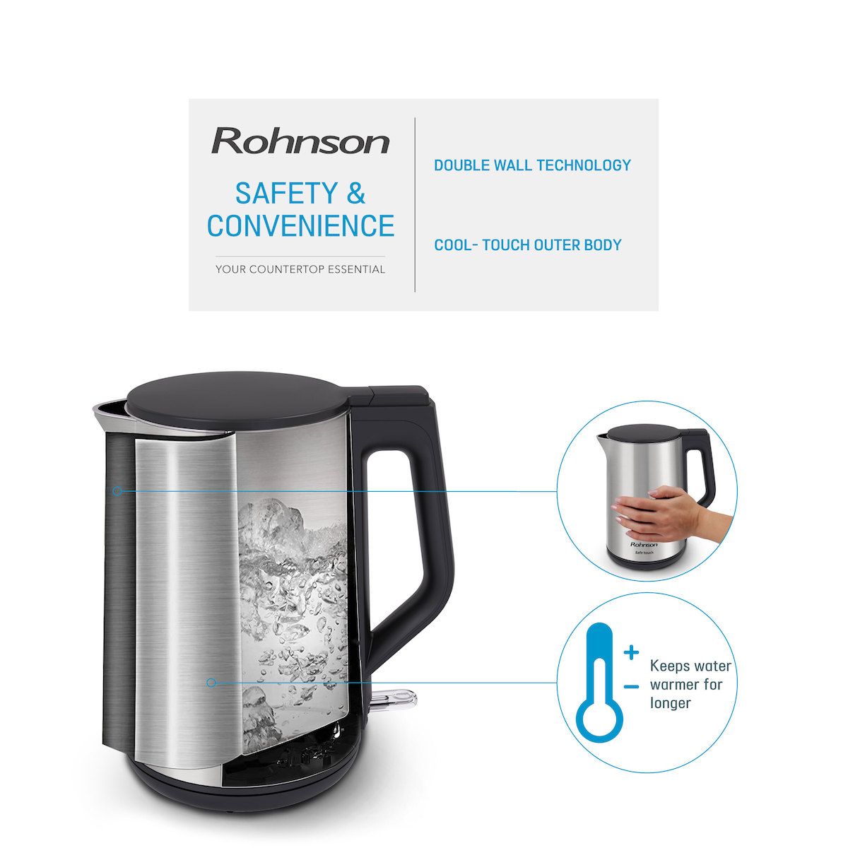 Βραστήρας Rohnson R-7530 με τεχνολογία διπλού τοιχώματος για μείωση της θερμοκρασίας στην εξωτερική επιφάνεια, με χωρητικότητα 1,5 lt αι ισχύος 2200 watt.