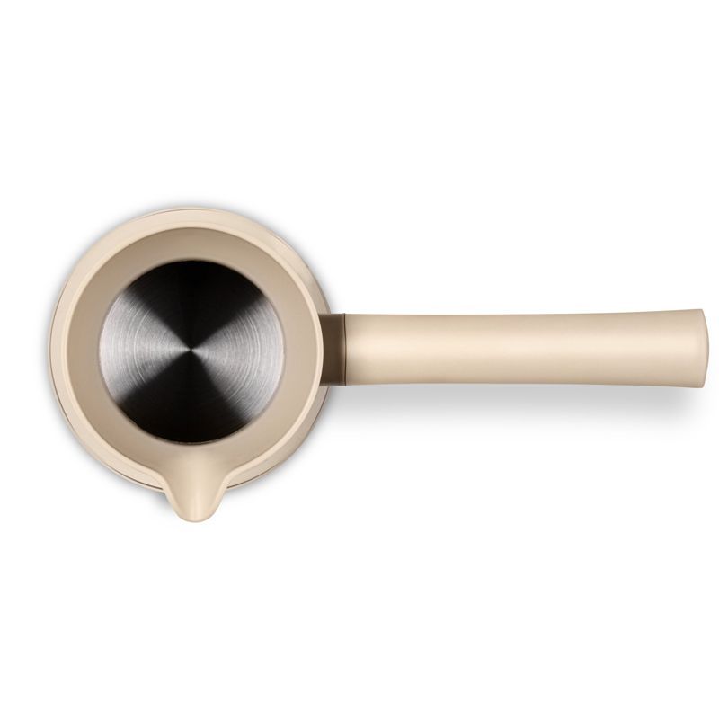 Ηλεκτρικό μπρίκι Meraki σε μπεζ χρώμα με φωτεινή ένδειξη λειτουργίας και σύστημα ασφαλείας για προστασία απο βρασμό χωρίς νερό απο τη Singer!