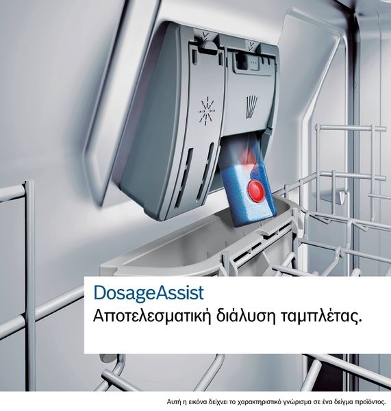 Το DosageAssist εξασφαλίζει βέλτιστο καθαρισμό με κάθε τύπου απορρυπαντικό. Σε περίπτωση χρήσης ταμπλετών, το απορρυπαντικό βγαίνοντας από τη θήκη του πέφτει σε μια ειδική υποδοχή στο πάνω καλάθι, όπου και διαλύεται πλήρως.