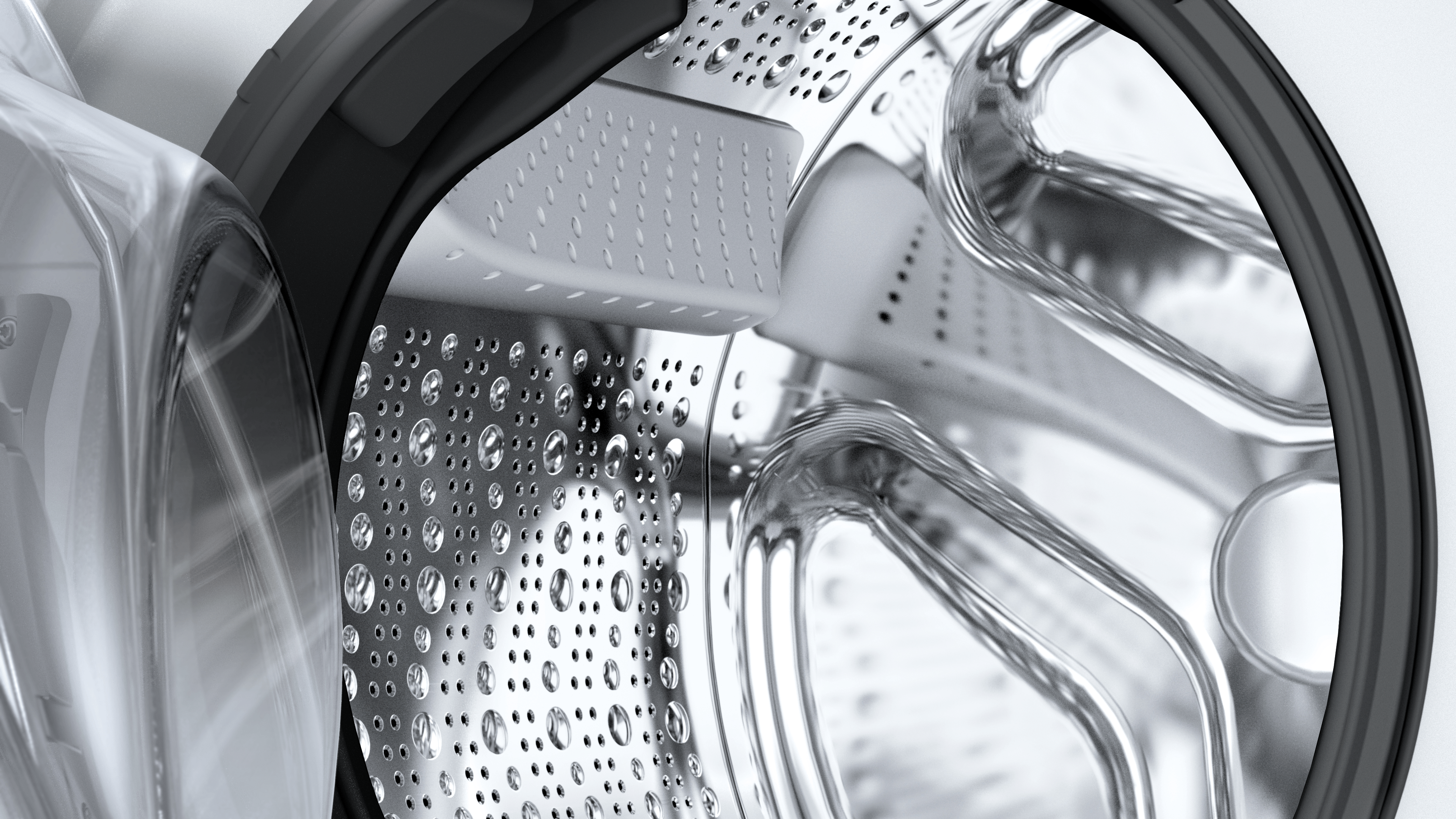 Τρισδιάστατος ψεκασμός νερού για γρήγορη και ομοιόμορφη διαβροχή των ρούχων. Επιπλέον, με συνεχή ροή νερού πίσω από τη γυάλινη πόρτα, τα υφάσματα προστατεύονται από την τριβή και τη φθορά.