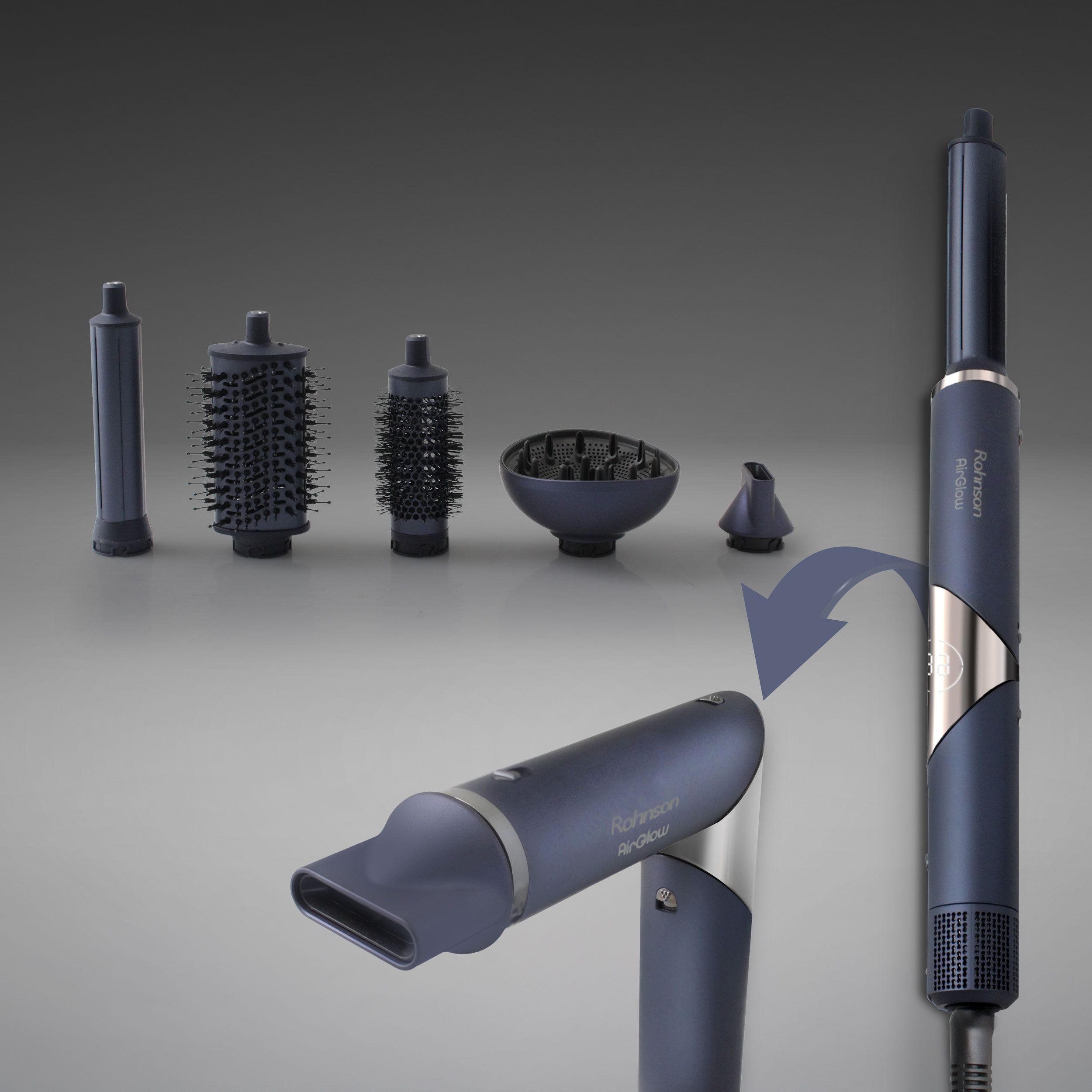 Ανακάλυψε το Rohnson AirGlow Multistyler R-688, το πρώτο διπλά, πτυσσόμενο styler που συνδυάζει ισχυρή απόδοση, κομψό design και ευκολία μεταφοράς. Αντικαθιστά πλήρως το κλασικό πιστολάκι μαλλιών, ενώ παράλληλα συνδυάζει τις λειτουργίες πολλών διαφορετικών συσκευών styling σε μία μόνο συσκευή. Δημιούργησε κάθε look — από λεία, λαμπερά μαλλιά έως εντυπωσιακές μπούκλες — με τη δύναμη της τεχνολογίας Coanda και την ποιότητα της Rohnson.