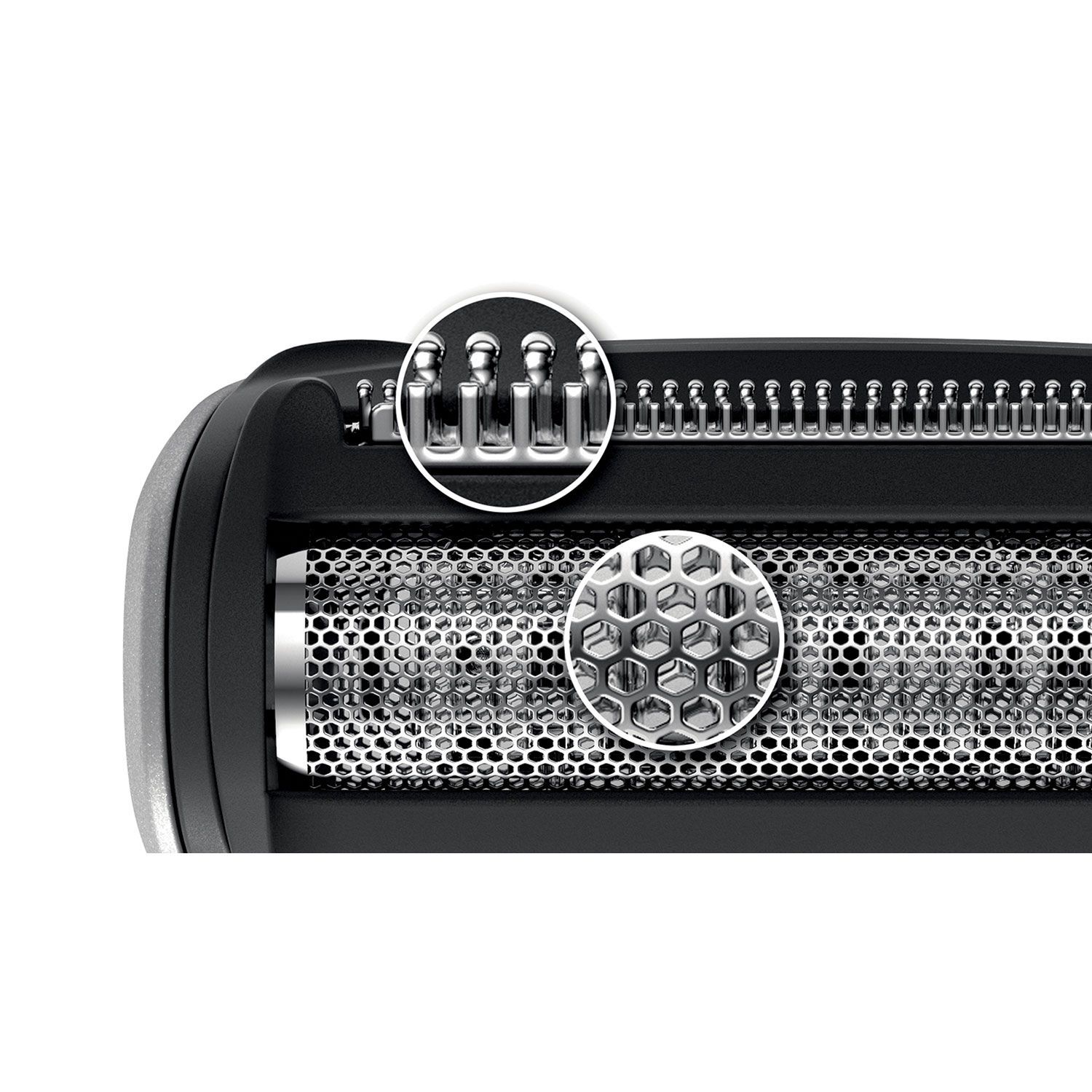 Η ξυριστική κεφαλή διαθέτει κατοχυρωμένες με δίπλωμα ευρεσιτεχνίας στρογγυλεμένες άκρες και ένα υποαλλεργικό πλέγμα για προστασία του δέρματός σας από ερεθισμούς και κοψίματα κατά τη διάρκεια του ξυρίσματος.